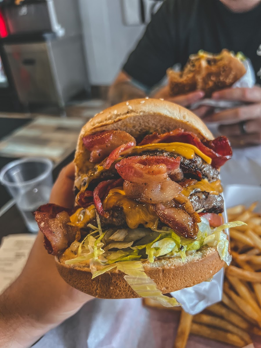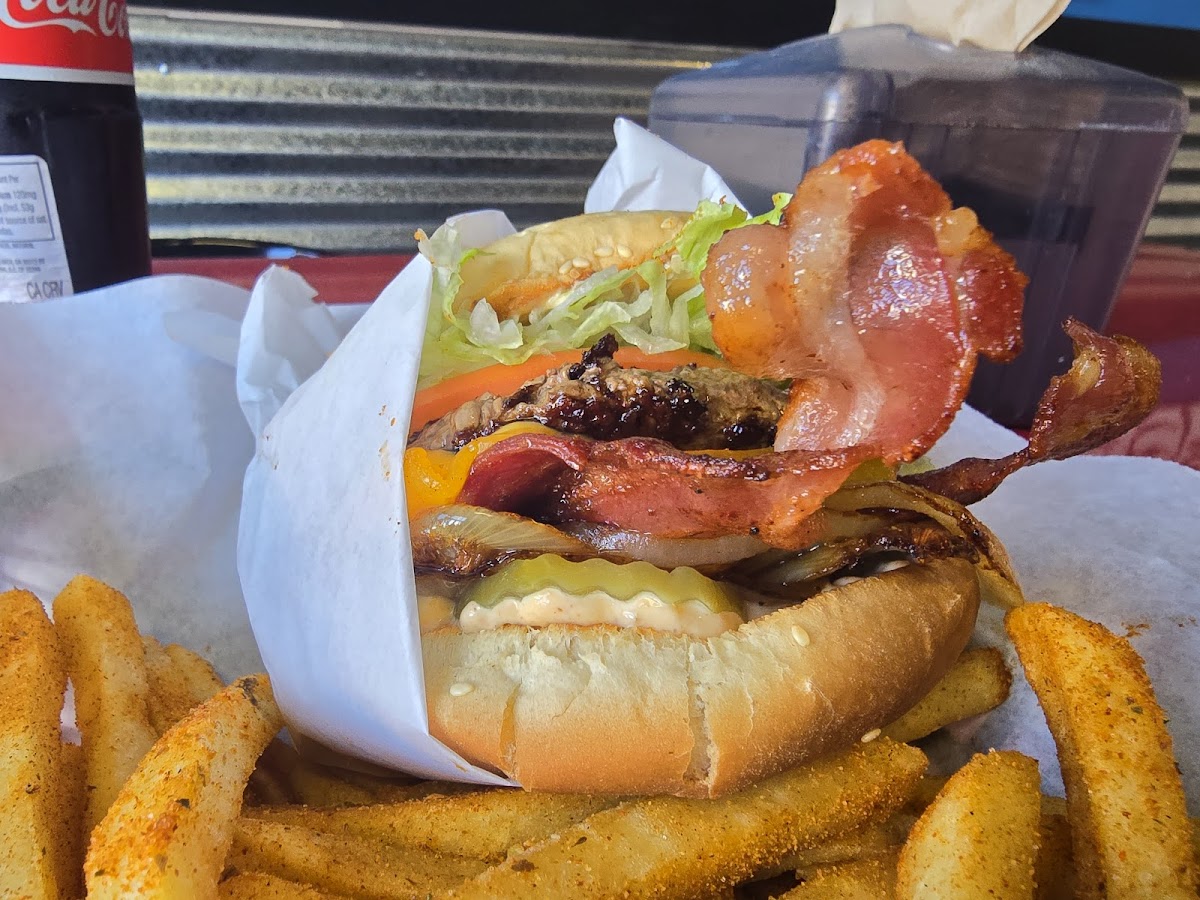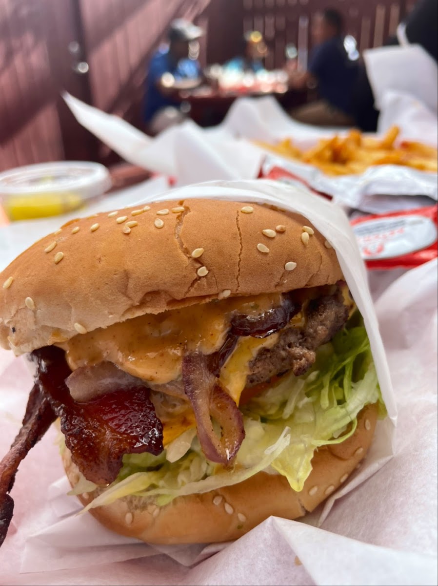 The burgers here are top tier. They are very flavorful every time I come here. My go-to is the Shaq burger. Yes! It is a really big burger and no I do not finish it. I usually cut it in half and share with my husband. I really like all the toppings they put on this burger. No other burger on the menu tastes like the Shaq burger. I wish they had a Shaq Jr just so I can have a smaller version. Oh and they give soooo many fries. If you’re a fries person then you’ll like this place. I always get the half fries and it comes with sooo many. I need a 1/3 of fries option lol. The overall takeaway, They give you a lot of food and the burgers are delicious and flavorful. Easy 5 stars ⭐